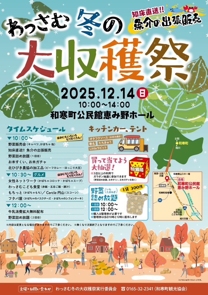 令和7年12月14日(日)に、わっさむ冬の大収穫祭が初開催されます!特産品である、和寒産カボチャ、越冬キャベツ販売の他に、玉ねぎ、ジャガイモの詰め放題やお米すくいなどのイベントが盛りだくさん!会場内ブースにて特産品を使用した店舗や、会場外にはキッチンカーも出店します。たくさんのご来場をお待ちしております!