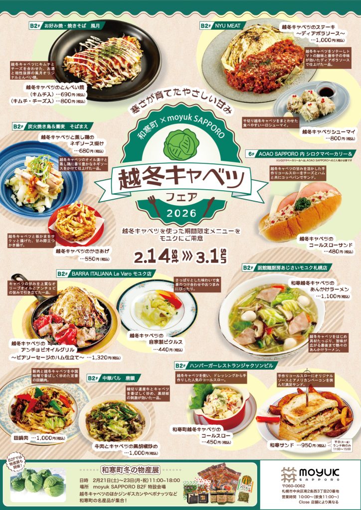 2月14日(土)~3月1日(日)まで、札幌市内にある商業施設『moyuk SAPPORO(モユクサッポロ)』にて『和寒町×moyuk SAPPORO越冬キャベツフェア2026』を開催します!